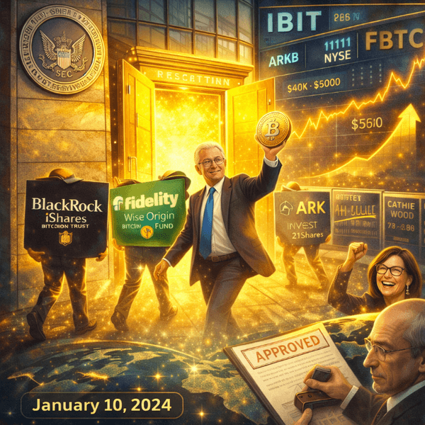 On January 10, 2024, the SEC approved 11 spot Bitcoin ETFs simultaneously. It was the most anticipated regulatory decision in crypto history. The Winklevoss twins had first applied for a Bitcoin ETF in 2013. It took over a decade of rejections, lawsuits, and lobbying to get to yes. The approval was transformative. For the first time, ordinary investors could buy Bitcoin exposure through their existing brokerage accounts, IRAs, and 401(k)s. No wallets, no exchanges, no private keys. Just a ticker symbol. Your grandmother could now have Bitcoin in her retirement account without knowing what a blockchain is. BlackRock's iShares Bitcoin Trust (IBIT) became the fastest-growing ETF in history, reaching $10 billion in assets faster than any ETF before it. By March 2026, IBIT alone holds approximately $76 billion - making it the dominant product in the category. Total US spot Bitcoin ETF assets sit at roughly $91.8 billion. Bitcoin's price responded. From roughly $46,000 at approval, BTC climbed past $100,000 within the year. The ETFs created a structural bid: every day, as new money flows in, the ETF managers must buy actual Bitcoin on the open market. Steady, daily, institutional buying pressure that did not exist before January 2024.